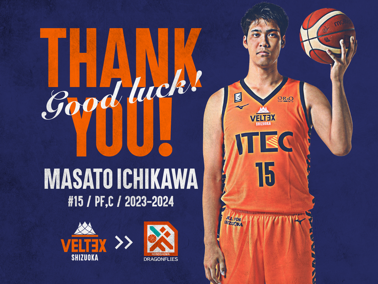 この度、ベルテックス静岡では #15 市川真人 選手との契約が満了となり、広島ドラゴンフライズ (B1)へ移籍することが決定しましたのでお知らせします。