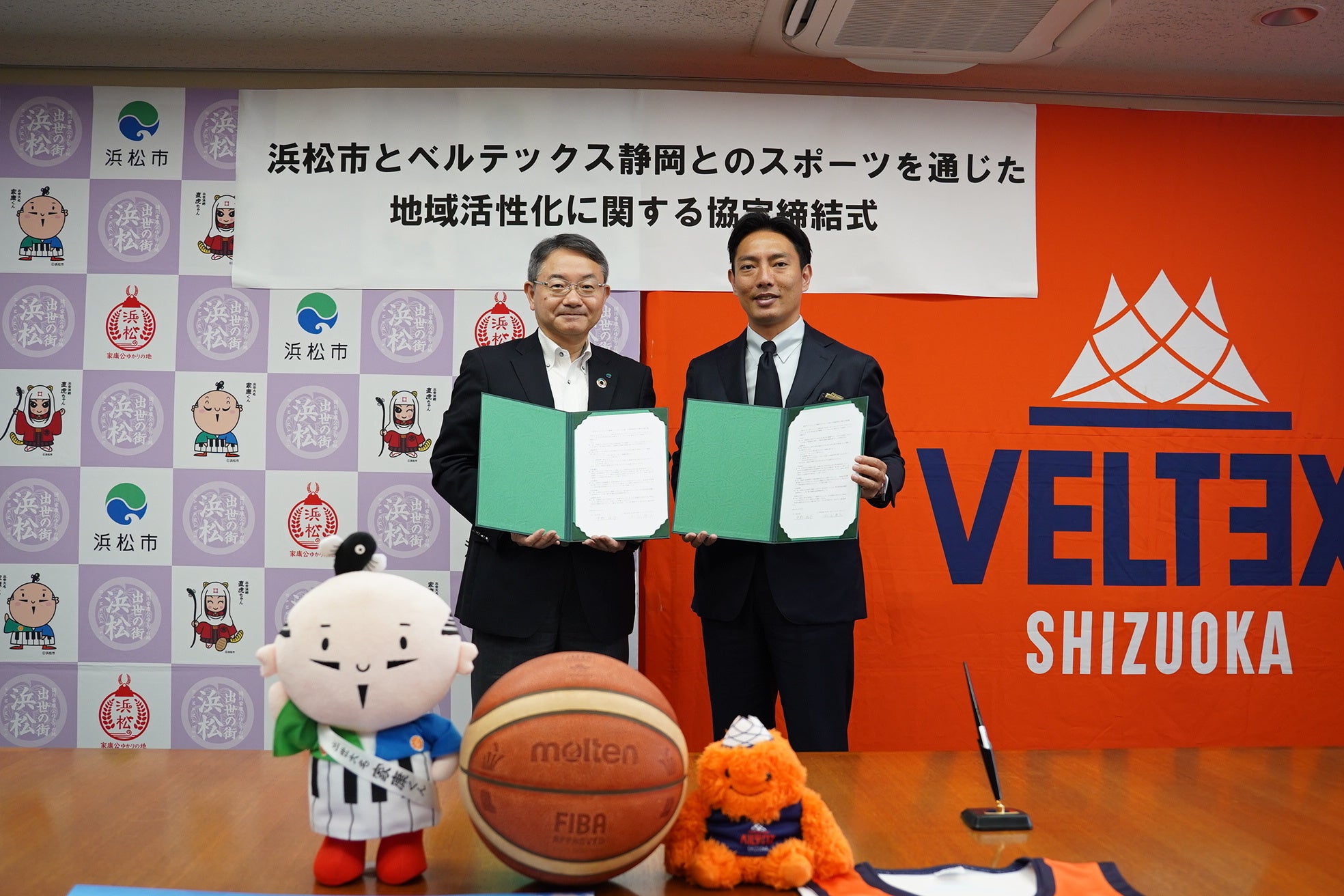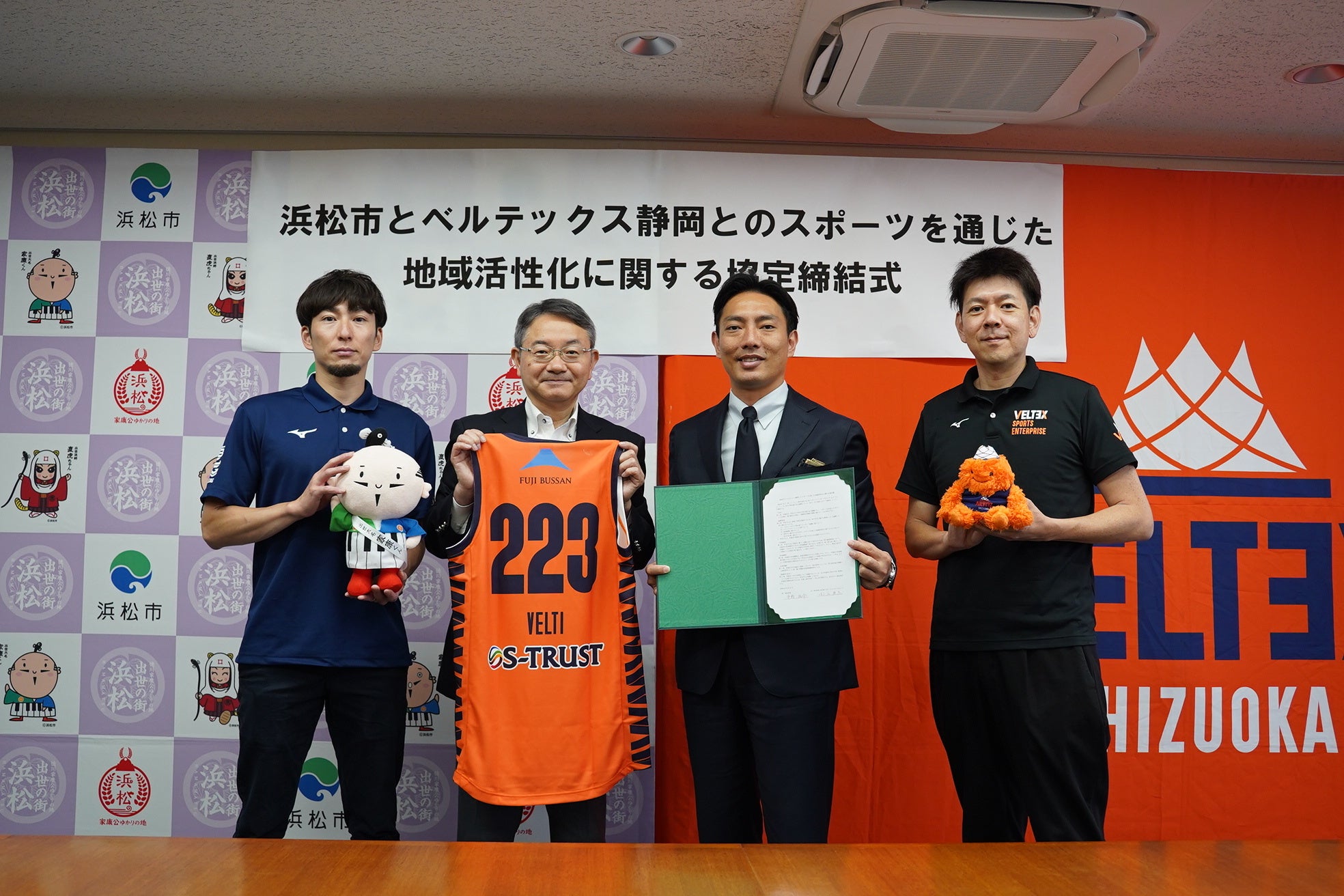 このたび、ベルテックス静岡は浜松市とスポーツを通じた地域活性化を促進するため、パートナーシップ協定(インクルーシブスポーツタウン協定)を締結し、6月27日(木)に浜松市役所において締結式を執り行いましたのでお知らせします。本協定は、相互協力並びに連携のもと、スポーツを通じた地域活性化に寄与し、持続的な地域の発展に寄与するという目的で締結するものとなります。