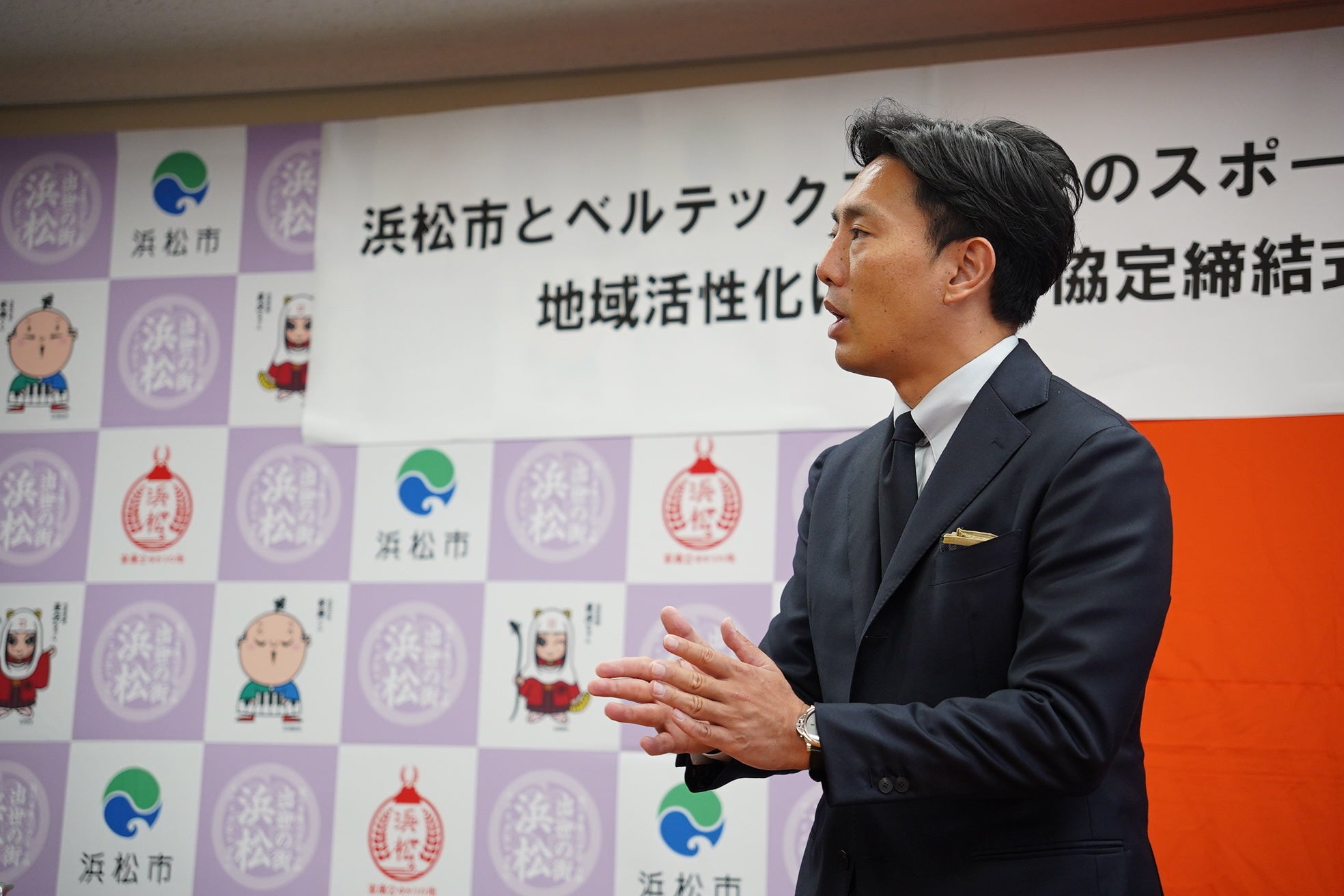 本日は浜松市とベルテックス静岡の皆さんとスポーツを通じた地域活性化に関する協定を締結させていただくことになり大変うれしく思っております。