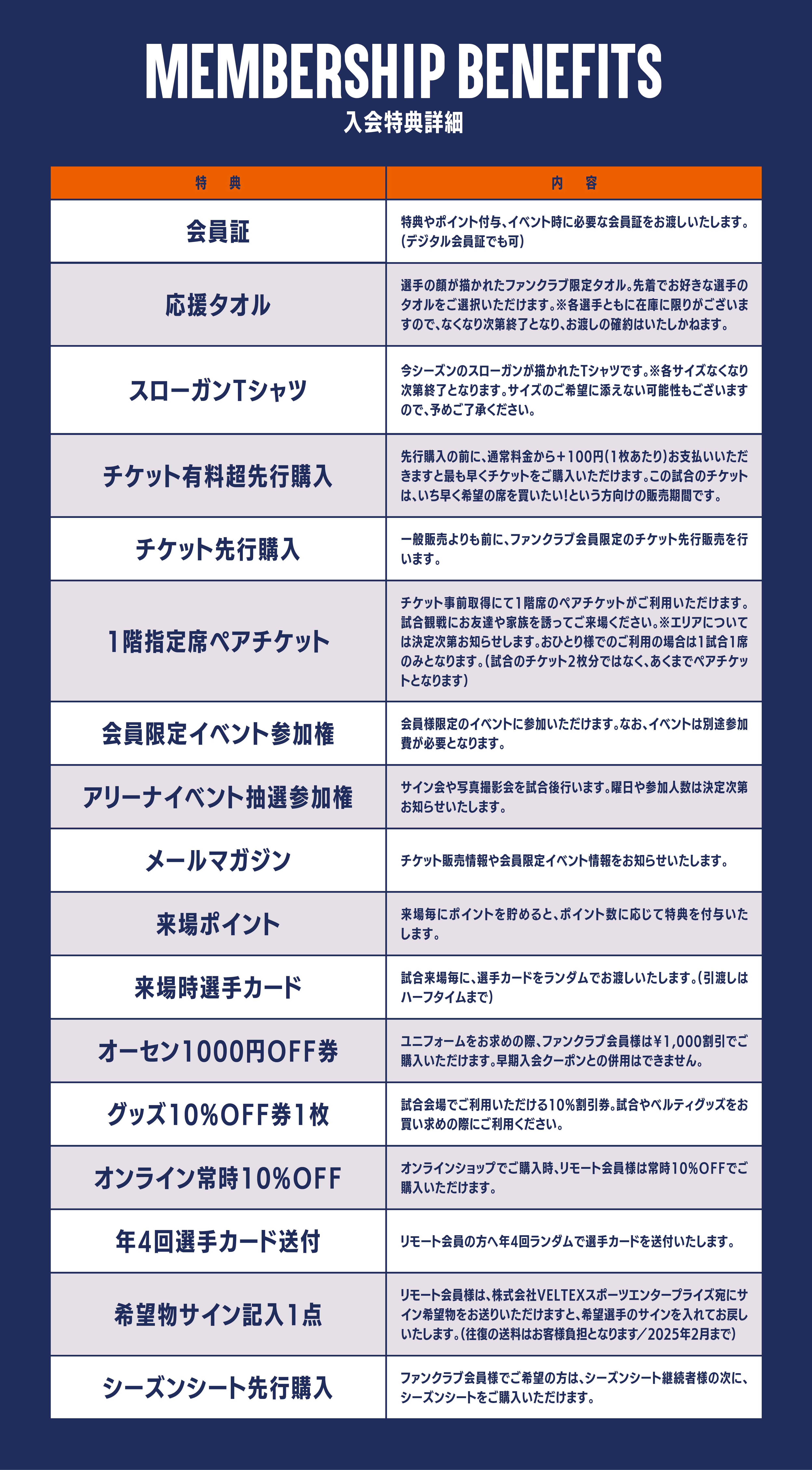 ・10月以降にご入会いただいたVELSTAR会員様のグッズ特典は、ホームゲーム会場でのお引換えとなります。(特典の引換期限は2025年3月30日までです)