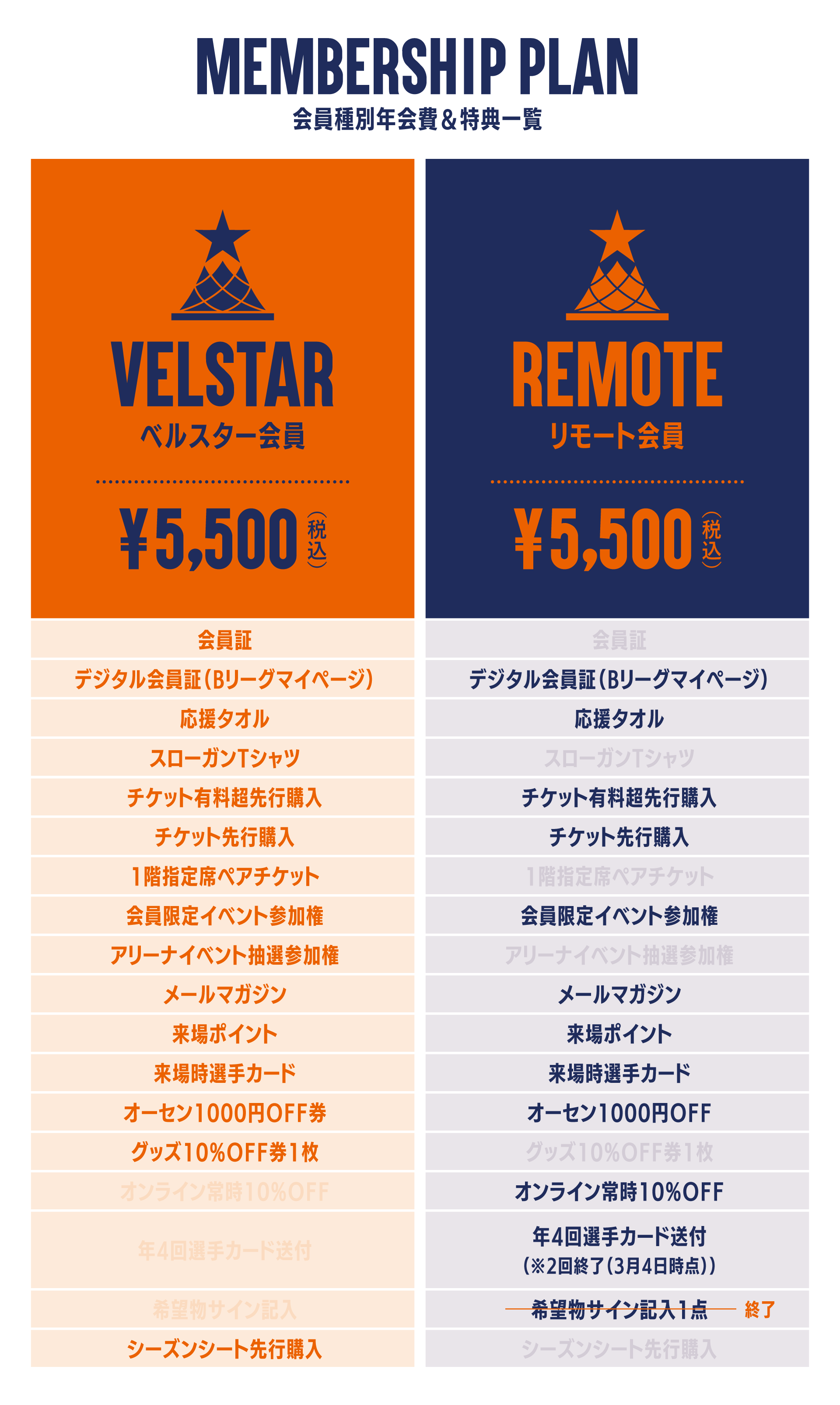 6シーズン目を迎えるに当たり、これまでの会員コースを一新し、ホームゲームやその他のオフラインのイベントを通したサービスを中心としたVELSTARコースと、ホームゲームにはなかなか足を運ぶことは難しいがクラブ・選手を応援したいと思ってくださっている方に向けたREMOTEコースの2コースの会員様を募集することとなりました。
