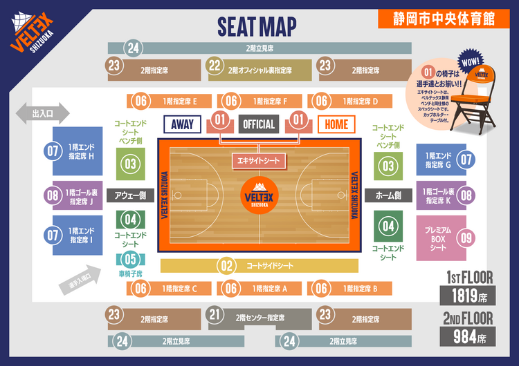 県内在住の未就学児・小中学生を対象とし、ベルテックス静岡ホームゲームの2階指定席の一部を無料で観戦できます。また差額をお支払いいただくことで、コート周りを除く各種指定席にも着席可能です。