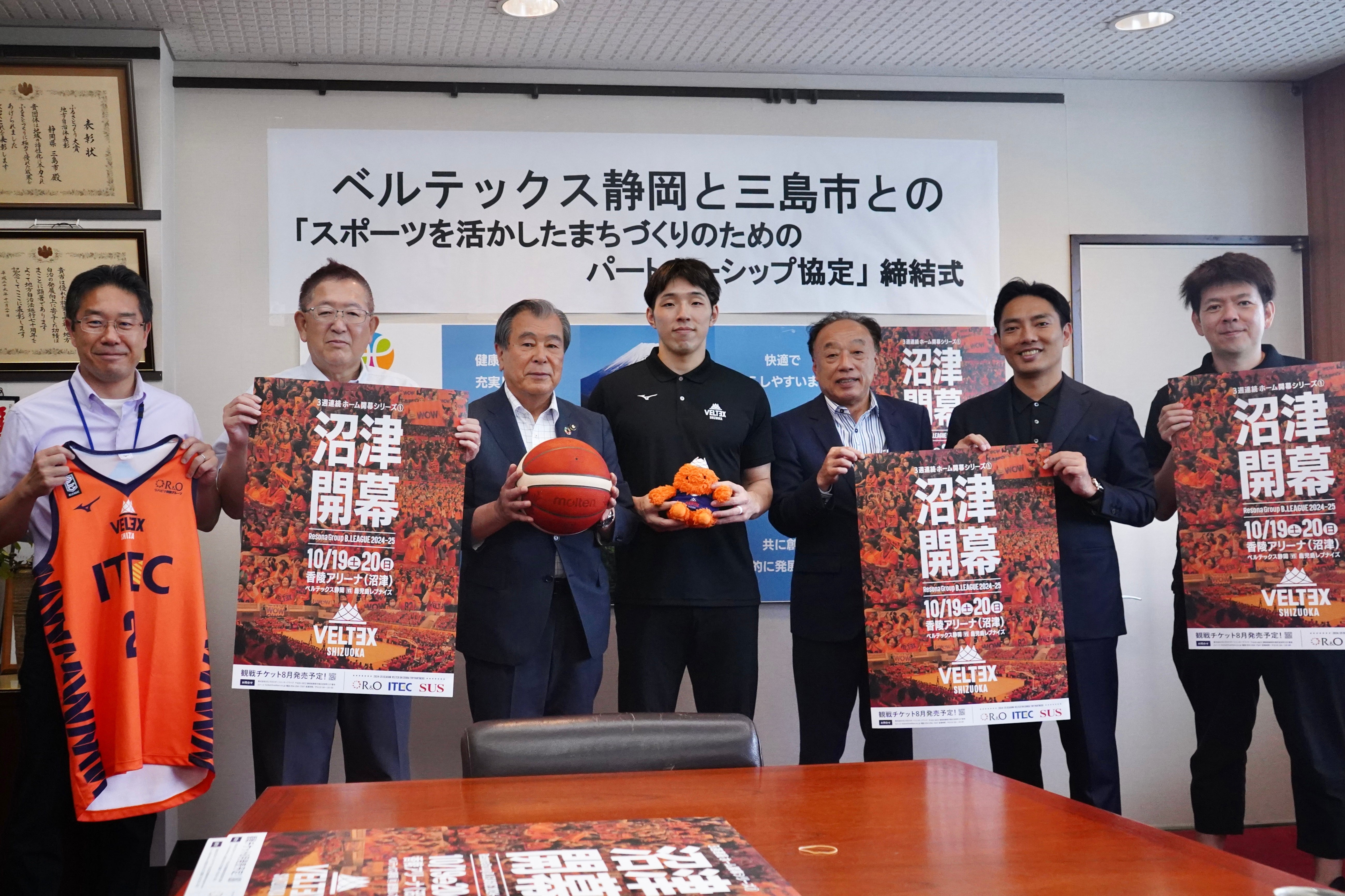 このたび、ベルテックス静岡は、三島市と両者の資源を有効に活用した協働による活動により、地域のさらなる発展に寄与することを目的とした「スポーツを活かしたまちづくりのためのパートナーシップ協定」を締結し、7月19日(金)に、三島市役所において締結式を執り行いましたのでお知らせします。