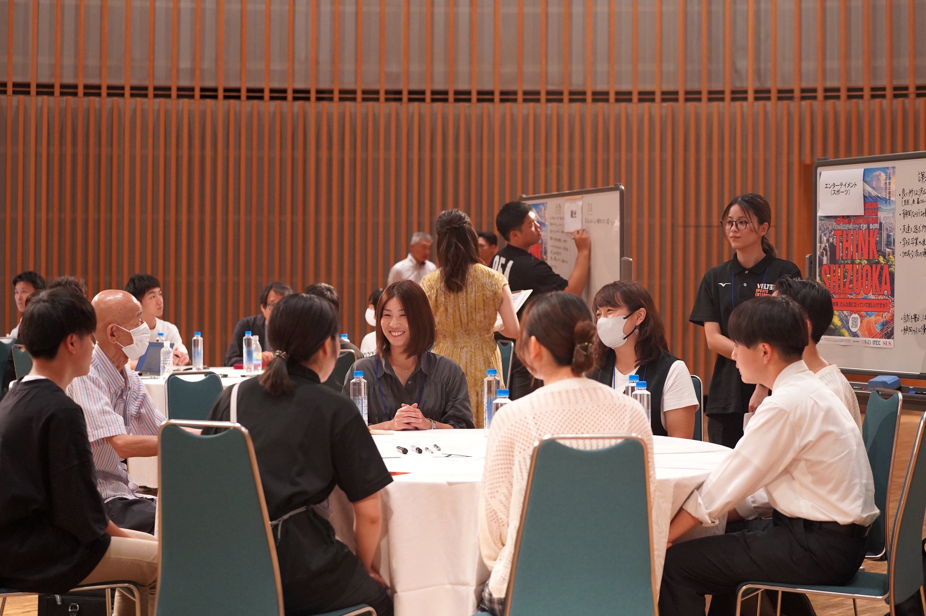 10代から60代の40名の参加者が5つのグループに分かれ、「健康・食」「教育」「エンターテイメント・スポーツ」「観光」「仕事」5つのテーマに沿った静岡の現在の課題や未来について意見交換を行いました。