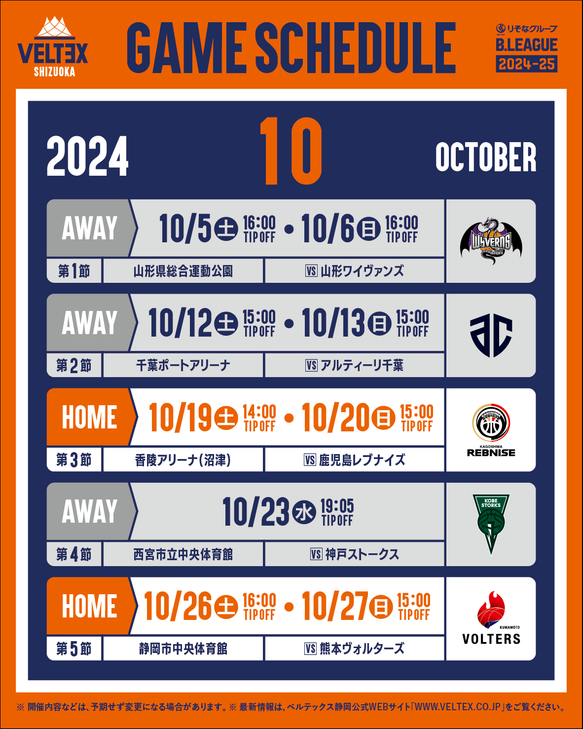りそなグループB.LEAGUE 2024-25 SEASON 第3節 10月19日(土) 鹿児島レブナイズ戦について、TIPOFF時間が下記の通り変更となりましたのでお知らせいたします。