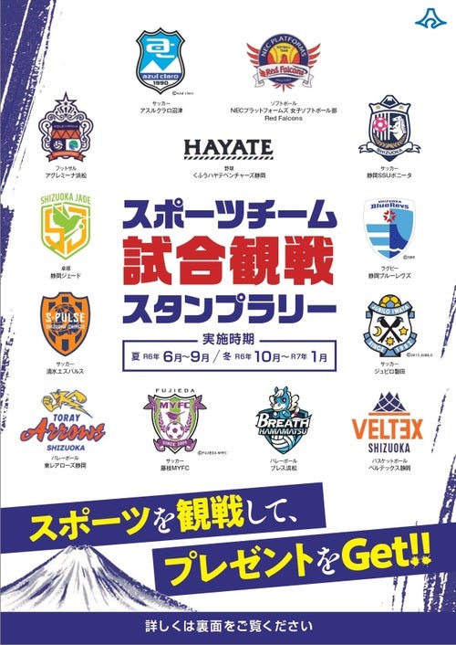 このスタンプラリーは、スポーツチームの試合会場がスタンプ獲得スポットとなっており、3チーム試合を観戦すると静岡県内の飲食店や、宿泊施設で使用できる電子マネー「TIPSポイント」1,000円分をプレゼント!