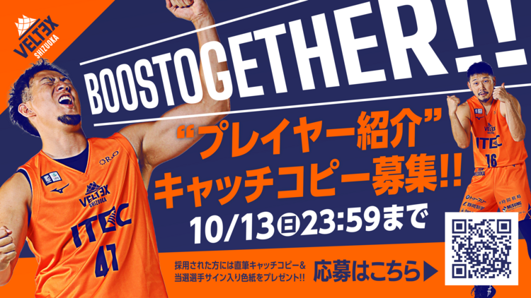 今シーズンは、森HCのもと、新生ベルテックス静岡がスタートし、初めてホームゲームへ来られる方にもクラブのことはもちろん、コートで熱く戦う選手たちをより多くの方へ知ってもらうべく、選手を紹介するキャッチコピーを募集します!