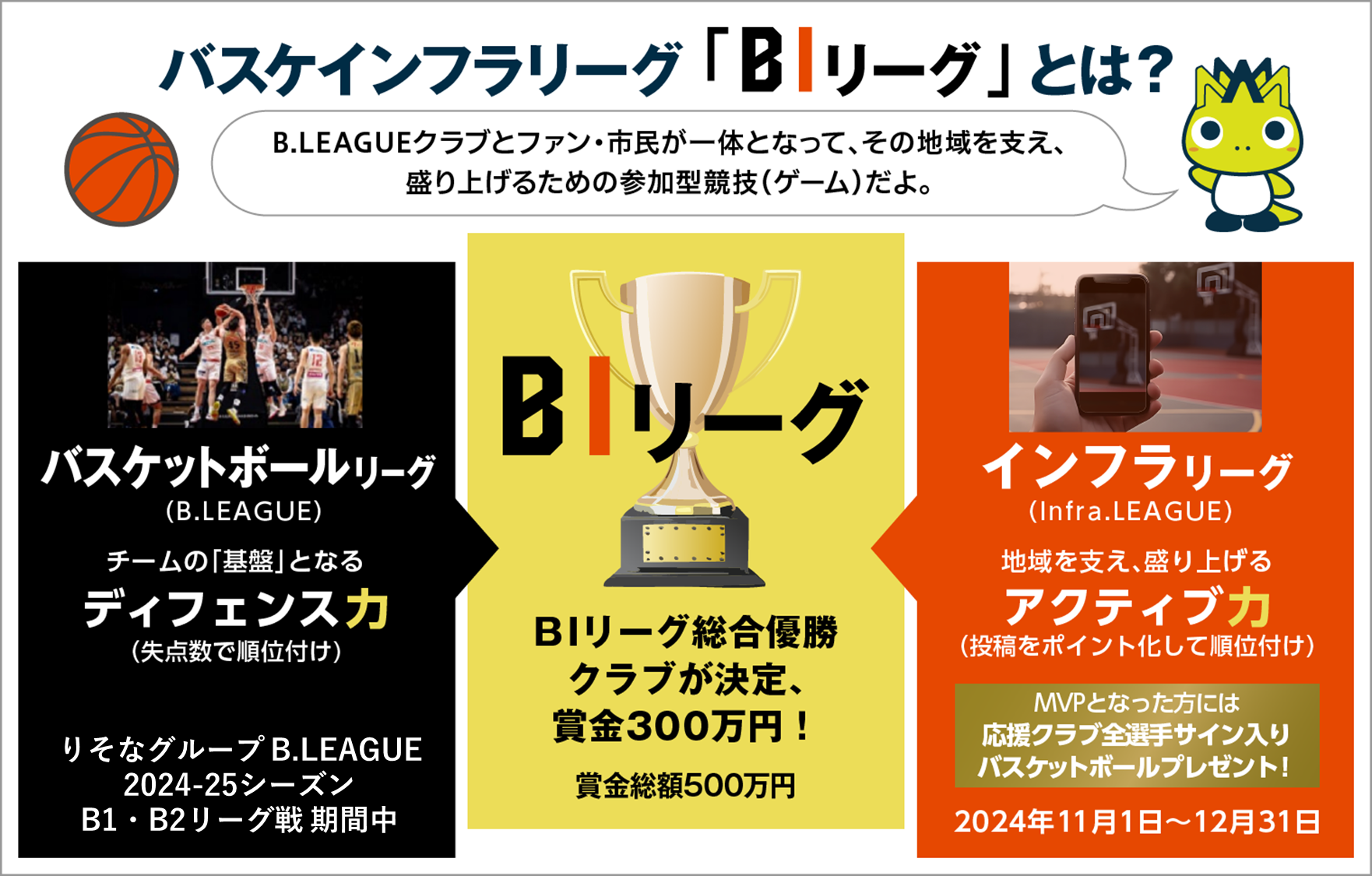 クラブとファン・市民の皆さまが一体となって、バスケットボールやB.LEAGUEクラブがある地域を支え、盛り上げるための参加型競技(ゲーム)「バスケインフラリーグ(BIリーグ)」がスタートしました。