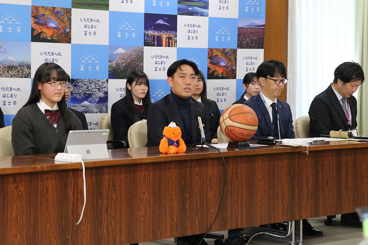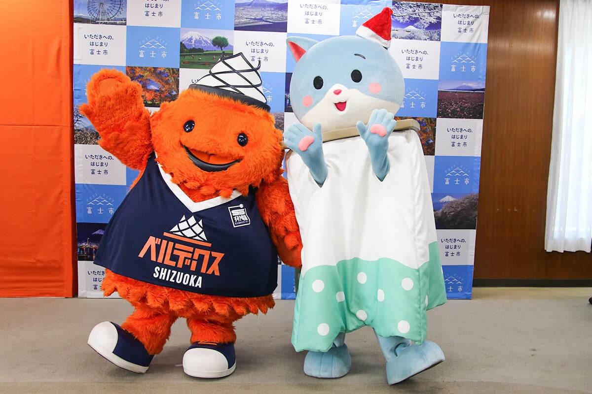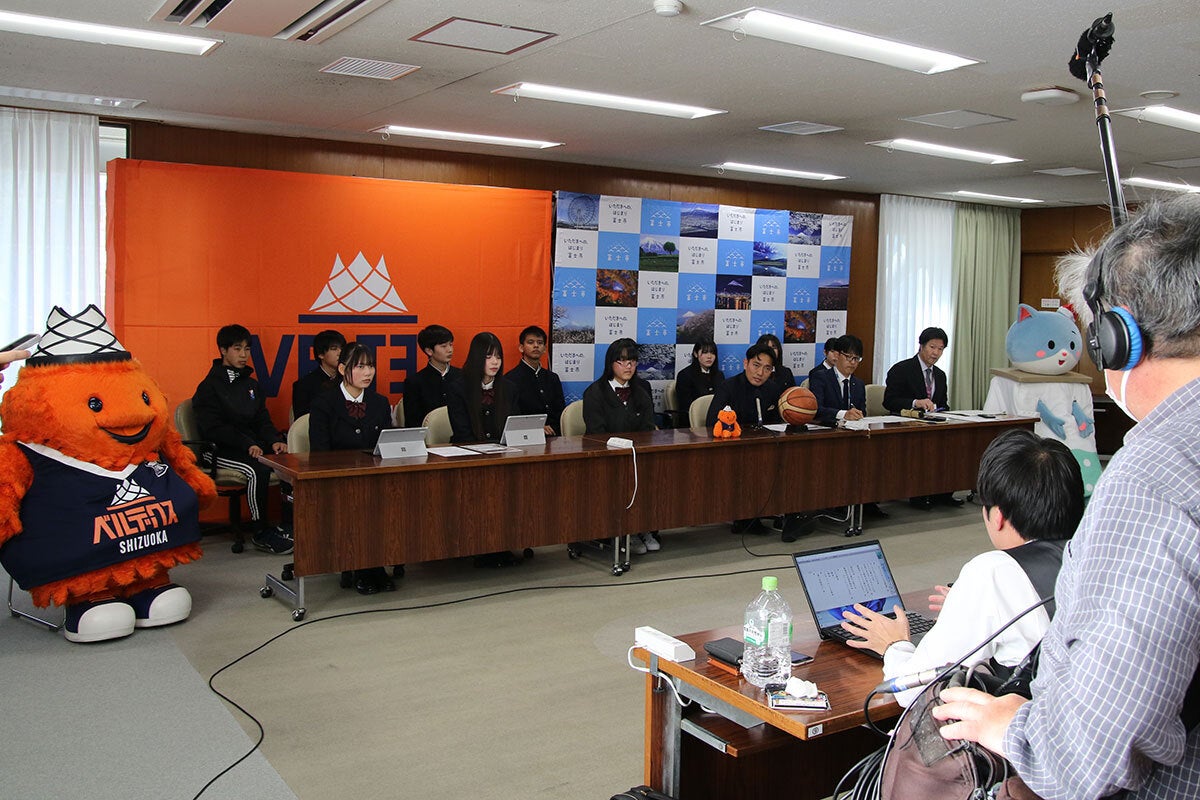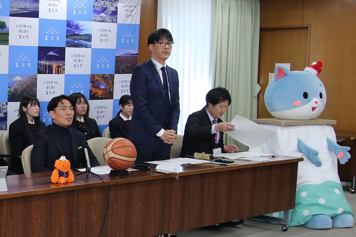 2024年12月23日(月)に富士市役所において、ベルテックス静岡のりそなグループB.LEAGUE 2024-25シーズン最終節(2025年4月19・20日、バンビシャス奈良戦)の試合会場が、2025年4月1日に竣工予定の富士市総合体育館「北里アリーナ富士」に決定したことが発表されました。会見にはベルテックス静岡・松永康太代表、富士市交流観光課、富士市立高校の生徒有志が参加。富士市立高の生徒からは、当日会場を盛り上げるための「ベルテックス静岡×富士市立高校コラボ」の取り組みについての発表などもありました。この日はベルティと富士市シティプロモーション大使「さもにゃん」も登場、会場を盛り上げてくれました。