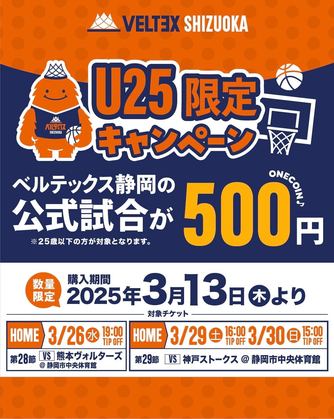 この度、りそなグループB.LEAGUE 2024-25 レギュラーシーズン最後の静岡市中央体育館開催となる3月26日(水)熊本戦、29日(土)-30日(日)神戸戦の3連戦で25歳以下限定で、500円でチケットをご購入いただけるキャンペーンの実施することが決定いたしました!