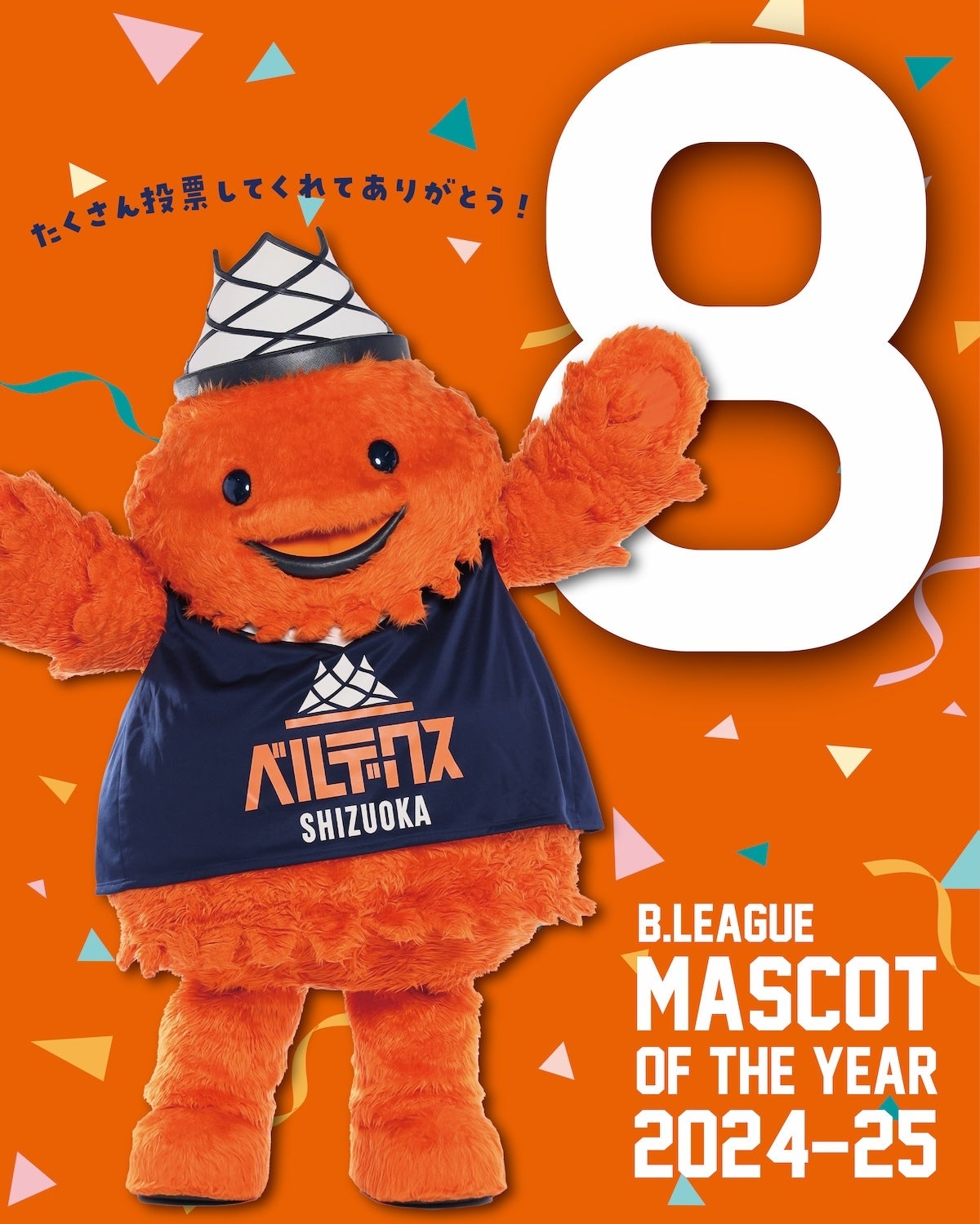 昨年の第10位からランクアップして、第9位を目標に活動をしてきたベルテックス静岡公式マスコットキャラクターのベルティは、B1~B3 全50体のうち【 第8位 】の結果となりました!