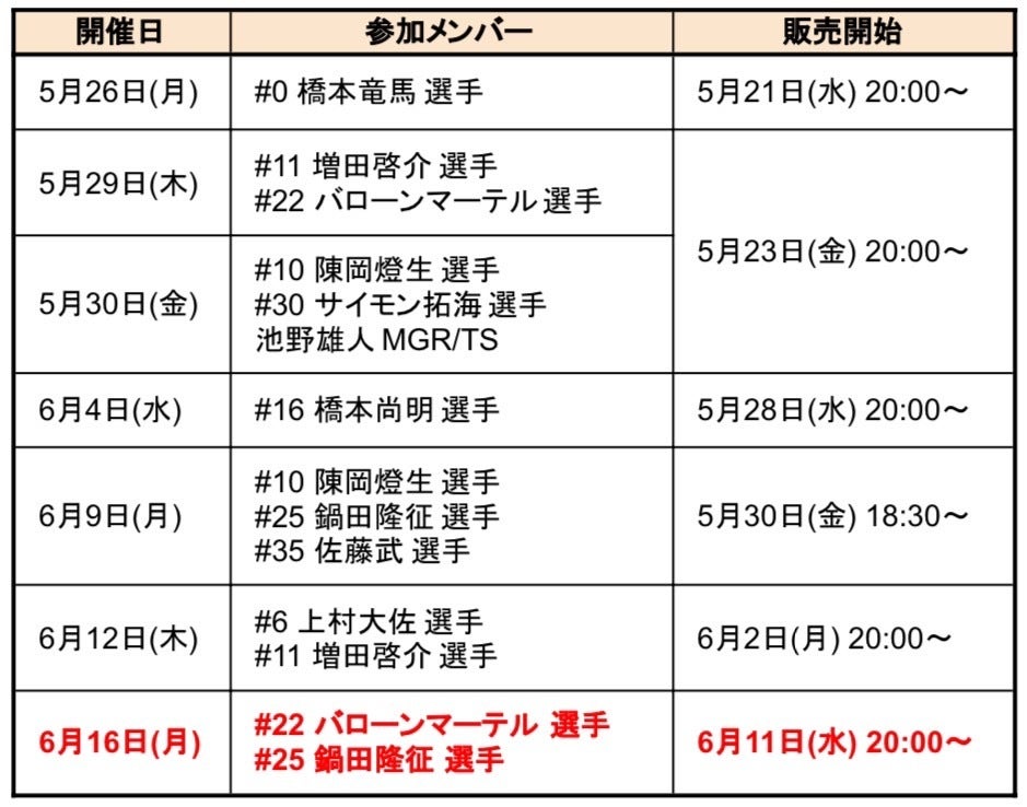 6月16日(月)に、#22 バローンマーテル選手・#25 鍋田隆征選手 参加会の追加実施が決定いたしました。チケット販売は6月11日(水) 20:00より実施いたします。