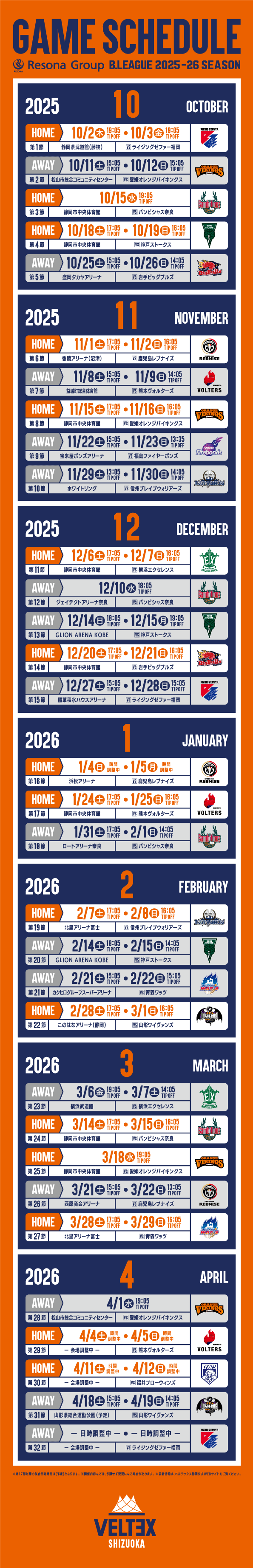 ※ 第17節以降の試合開始時間は予定であり、変更となる場合がございます。最新情報はベルテックス静岡公式HPよりご確認ください。