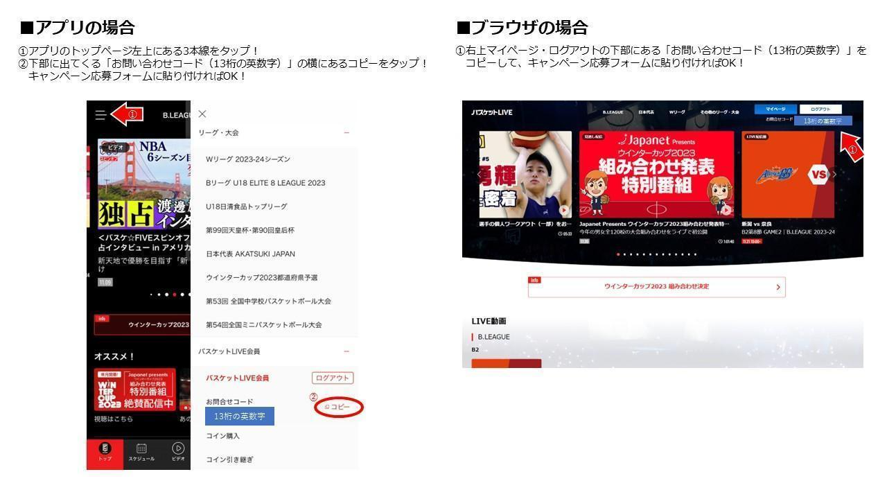 ・応募にはバスケットLIVEの「お問い合わせコード」が必要です。