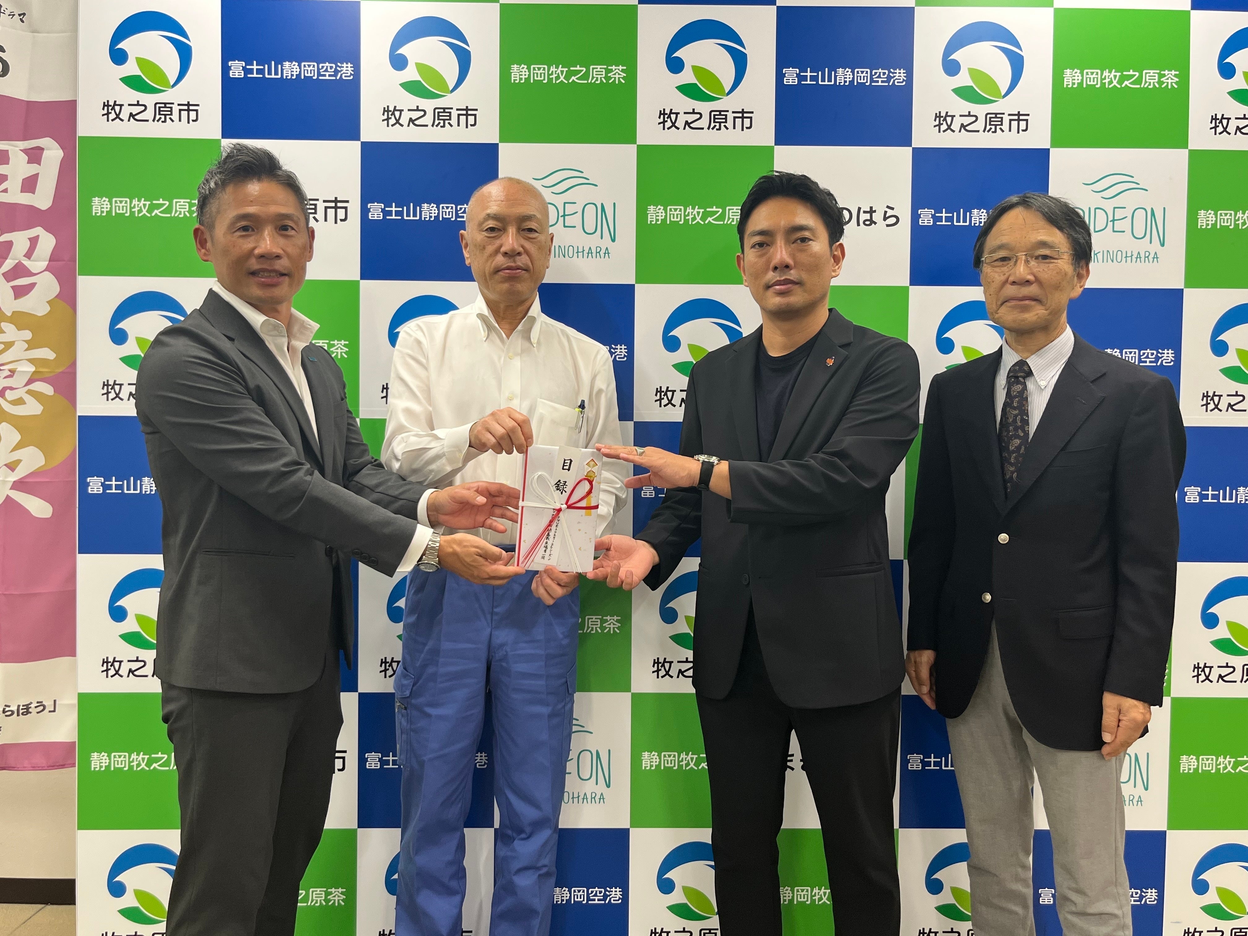 また、10月20日(月)に皆さまを代表して株式会社VELTEXスポーツエンタープライズ代表取締役社長 松永康太と、三井住友海上火災保険株式会社 静岡支店長 牛島大介様が、牧之原副市長 大石勝彦様、牧之原市 教育長 橋本勝様を表敬し、皆さまからお寄せいただいた募金をお届けいたましたので、併せてご報告いたします。