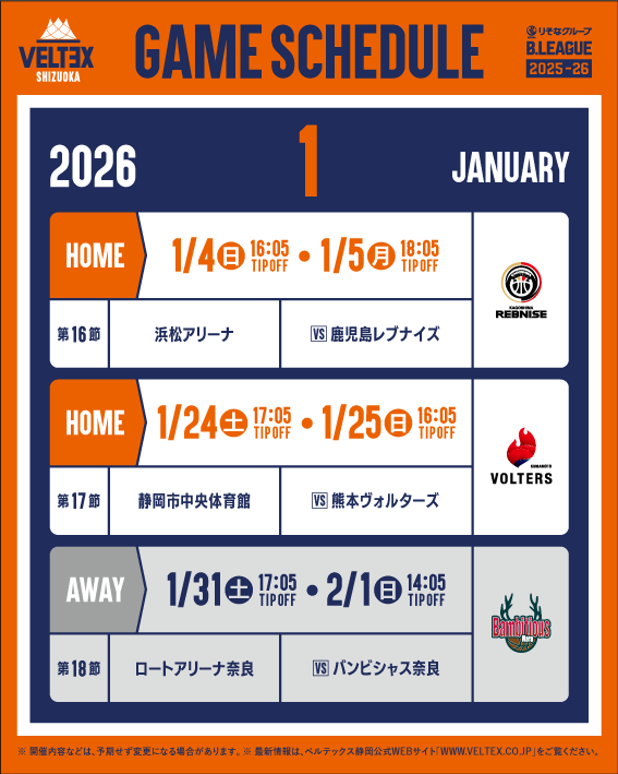 りそなグループ B.LEAGUE 2025-26 B2リーグ戦 第16節 鹿児島レブナイズ戦につきまして、調整中となっておりました試合開始時間が下記の通り決定いたしましたのでお知らせいたします。