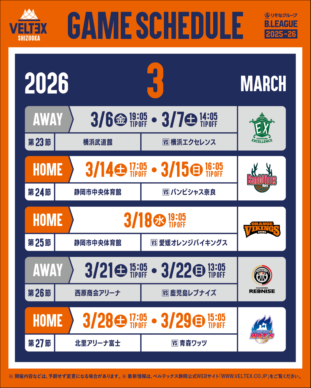 3月29日(日)開催のりそなグループB.LEAGUE 2025-26シーズンB2リーグ戦 第27節 青森ワッツ戦DAY2につきまして、試合時間が下記の通り変更となりますのでお知らせいたします。