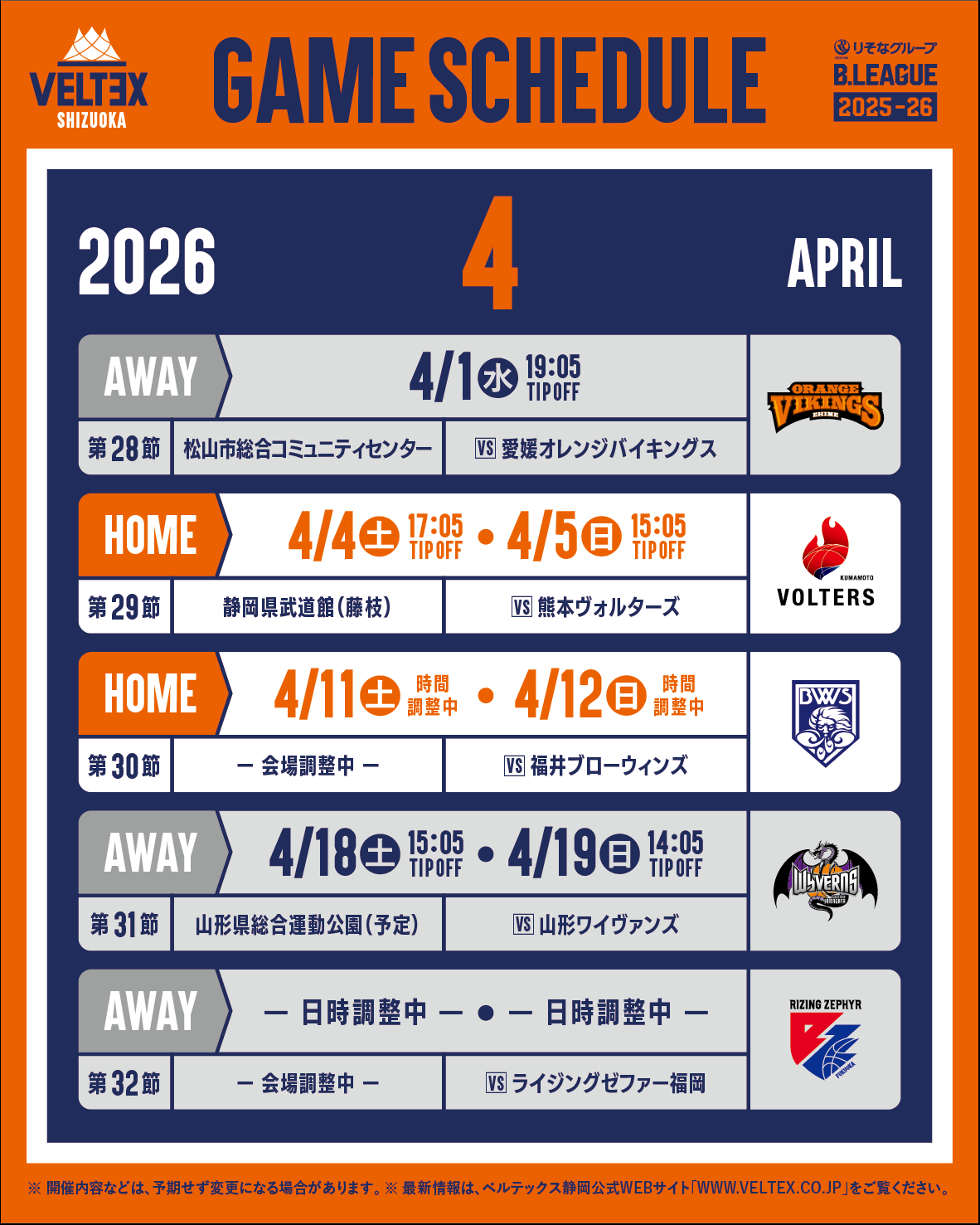 また、4月4日(土)・5日(日)開催の 第29節 熊本ヴォルターズ戦につきまして、会場および試合時間が下記の通り決定しましたので併せてお知らせいたします。