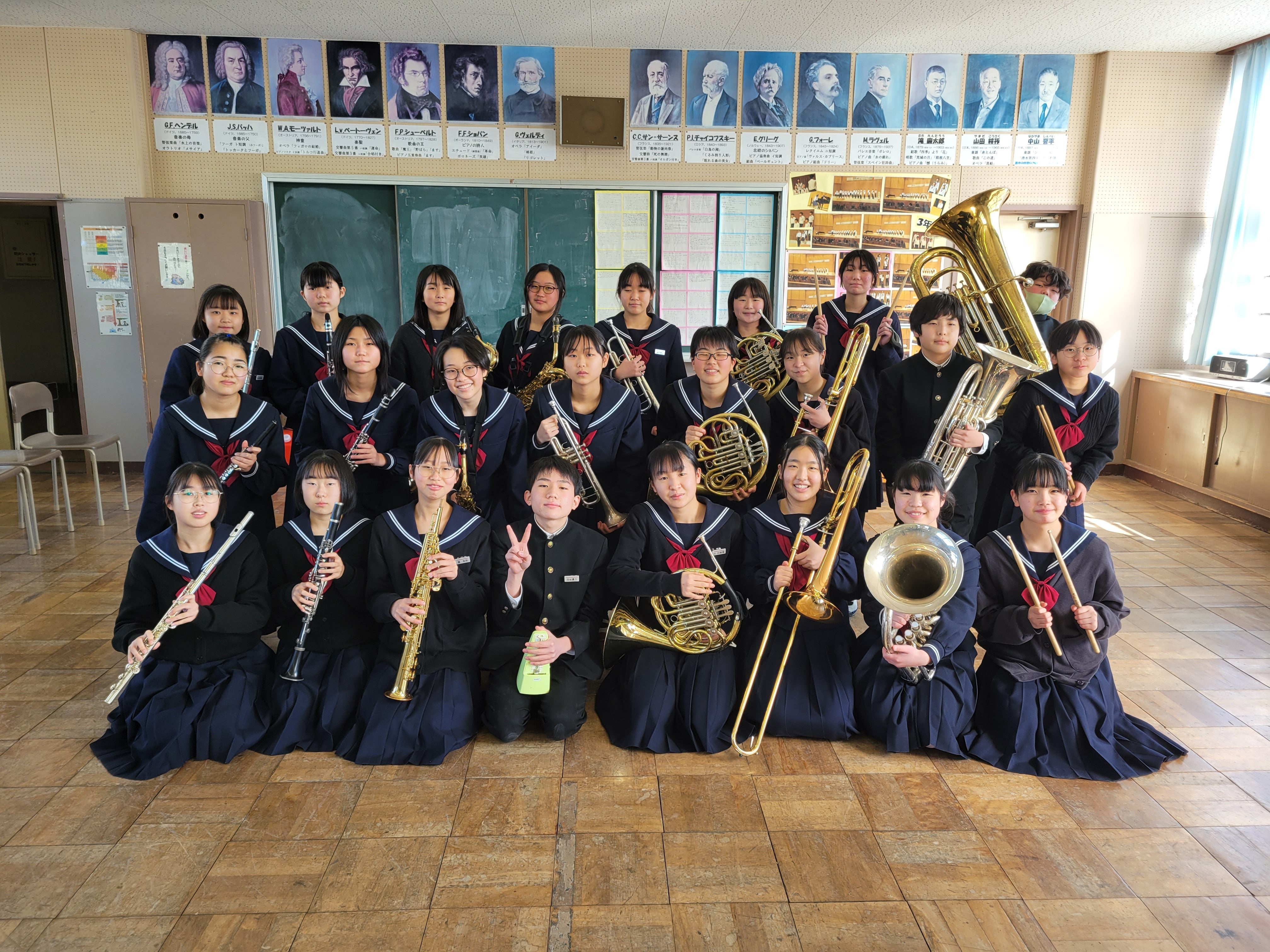 静岡市立清水第四中学校吹奏楽部です。現在、2年生1 3人、1年生1 3人の合計 26 人で活動しています。楽しく団結し、成長していくという意味の「楽団優勝」をキーワードに、学年、男女関係なく仲の良い、笑顔の絶えない仲間たちと、真剣に練習に取り組んでいます。 四中吹奏楽部らしい演奏で体育館を明るく楽しい雰囲気にして、バスケットボールの試合を盛り上げることができるように頭張ります!よろしくお願いします!