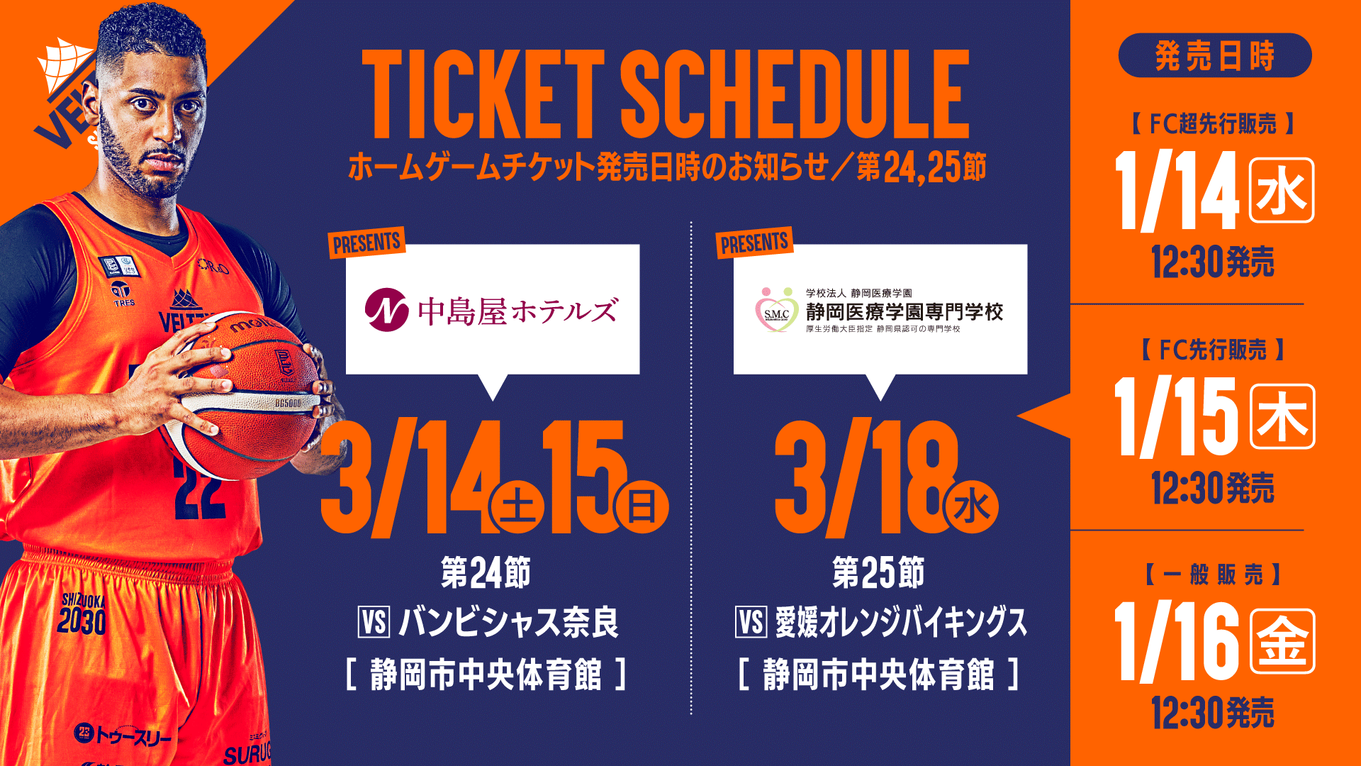 りそなグループB.LEAGUE 2025-26シーズン B2リーグ戦 第24節 バンビシャス奈良戦・第25節 愛媛オレンジバイキングス戦のチケット販売についてご案内いたします。