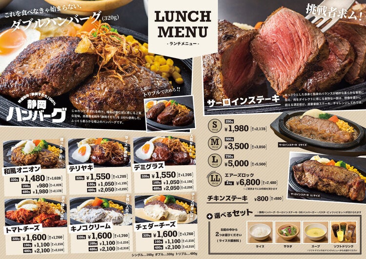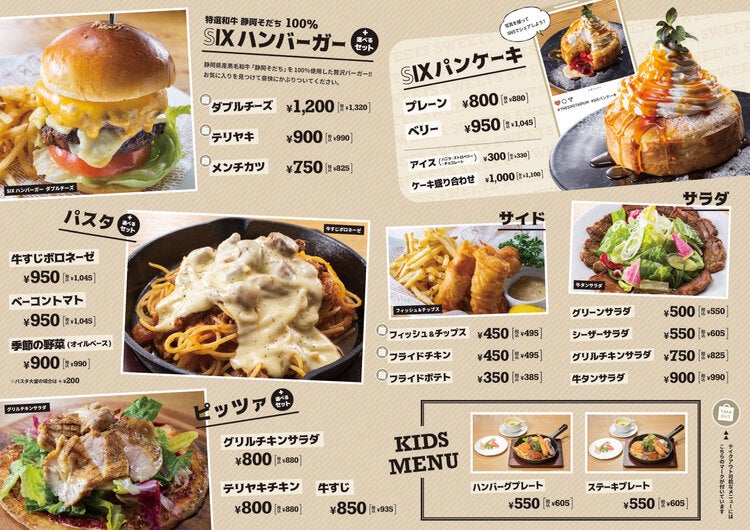 特選和牛「静岡そだち」100%のハンバーグや1kgのサーロインステーキ、他にもハンバーガーやパスタにスウィーツまで、素材や作り方にとことんこだわったグランドメニューがラインナップに加わりました。