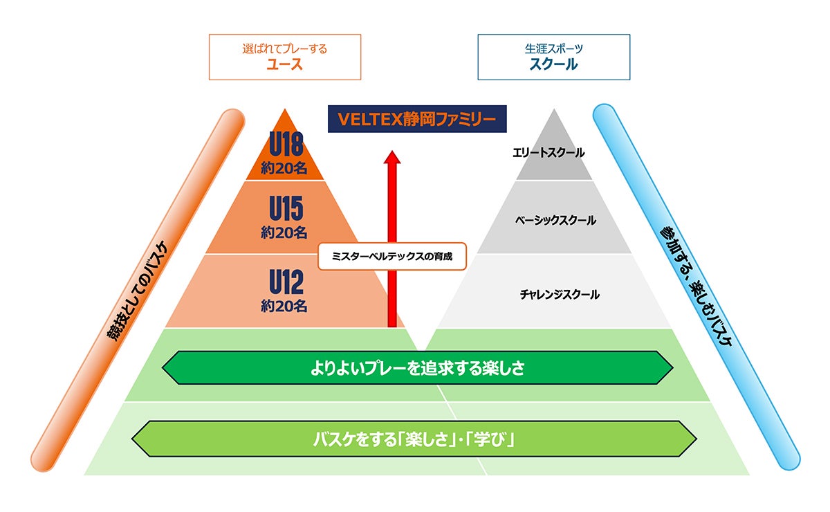 ベルテックス静岡の講師陣は元プロバスケット選手経験者や日本代表経歴を持つ指導者が在籍しています。自らの経験、体験をベースに初歩の初歩からわかりやすく徹底的に指導します。TOPチームの下部組織ということもあり、子ども達の目指すものも明確化されます。さらにVELTEX静岡の選手から直接指導を受けられる期間もあります。